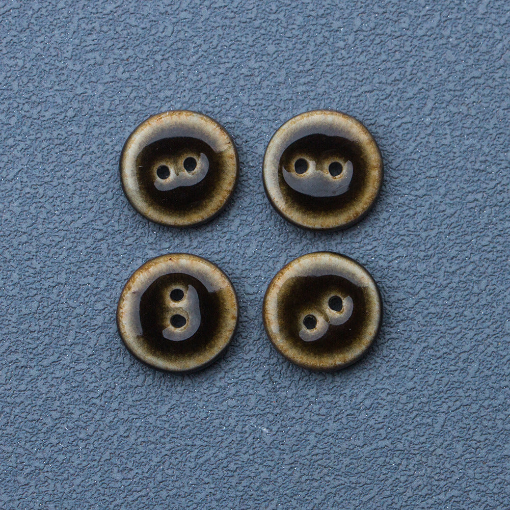 These 14mm ceramic buttons are a stylish choice. They have a round shape with two holes and are crafted by hand. The black and brown glazed finish gives them a sophisticated and classic look.