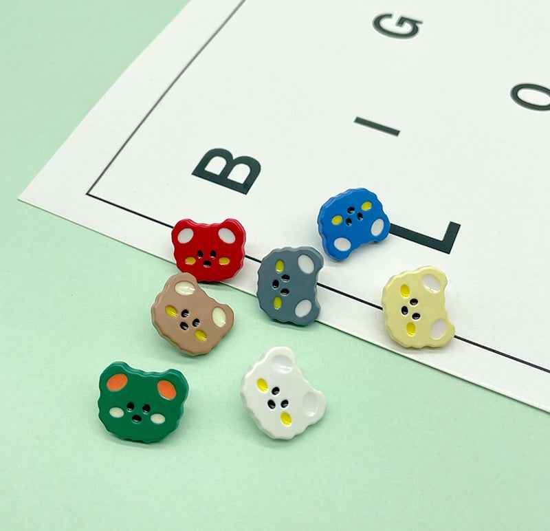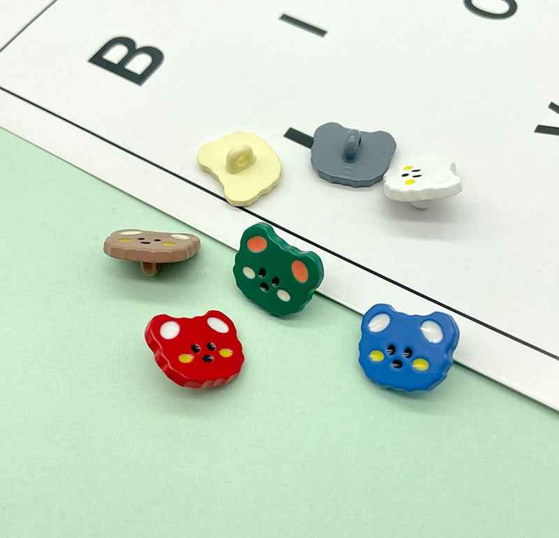 These 15/18mm plastic buttons feature charming cartoon teddy bear designs. They are the perfect addition to children’s sweaters, cardigans, coats, tops, and shirts. The buttons are made of durable plastic, ensuring they can withstand the active lifestyle of kids. Their cute appearance adds a touch of fun and playfulness to any outfit. With a suitable size and easy-to-sew holes, they are convenient for attachment. These buttons not only serve as practical fasteners but also as decorative elements that can make children’s clothing more attractive and unique, allowing kids to show off their style in a cute and lively way.