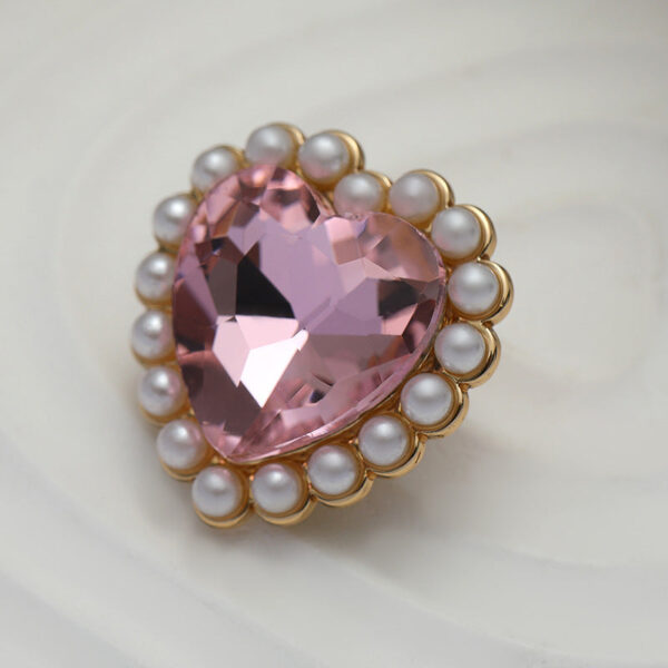 This 20mm pink diamond heart metal button is a true showstopper. The centerpiece is a beautiful pink diamond that sparkles and catches the light, adding a touch of elegance and femininity. The edges of the heart are delicately inlaid with pearls, enhancing its luxurious look.