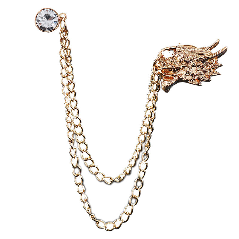 Golden Dragon Head Rhinestone Tassel Chain Collar Button for Men and Women – Fashionable and Domineering Animal Brooch Lapel Pin 5pcs