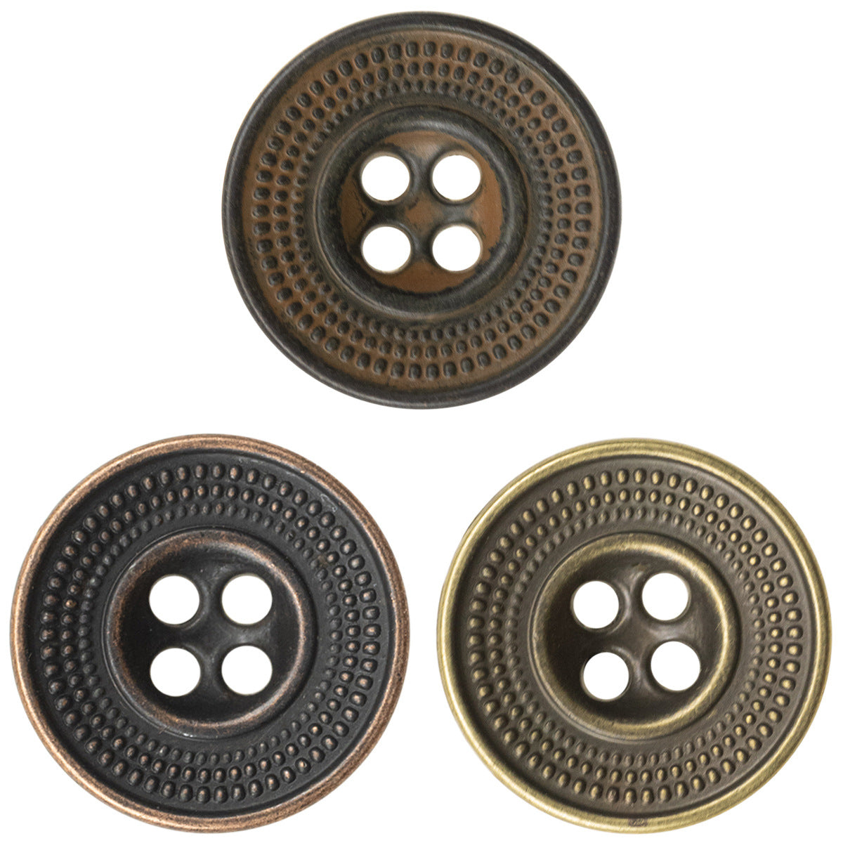 Add a touch of vintage charm to your retro fashion denim jacket with this wide-edged granular cap-shaped antique tin-colored metal button.