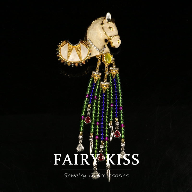 Handcrafted Enamel Pony Brooch with Tassel Pendant – Elegant Zirconia Accents for a Chic Look