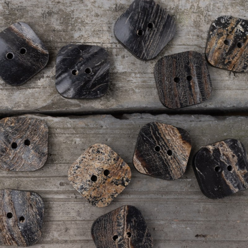 These unique black water buffalo horn buttons come in a variety of shapes including oval, square, triangle, and flower. Each button is crafted with care, showcasing the natural beauty and durability of water buffalo horn. The two-hole design makes them easy to attach to garments. These buttons are perfect for adding a touch of individuality and style to jackets, blouses, dresses, and more. The black color gives them a classic and sophisticated look that can be paired with a wide range of fabrics. Whether you’re looking for a unique accent for a handmade piece or want to upgrade a store-bought item, these buttons are a great choice.